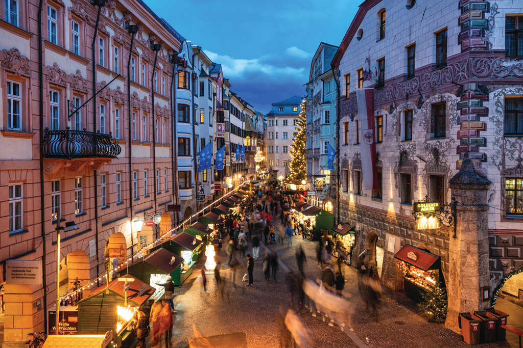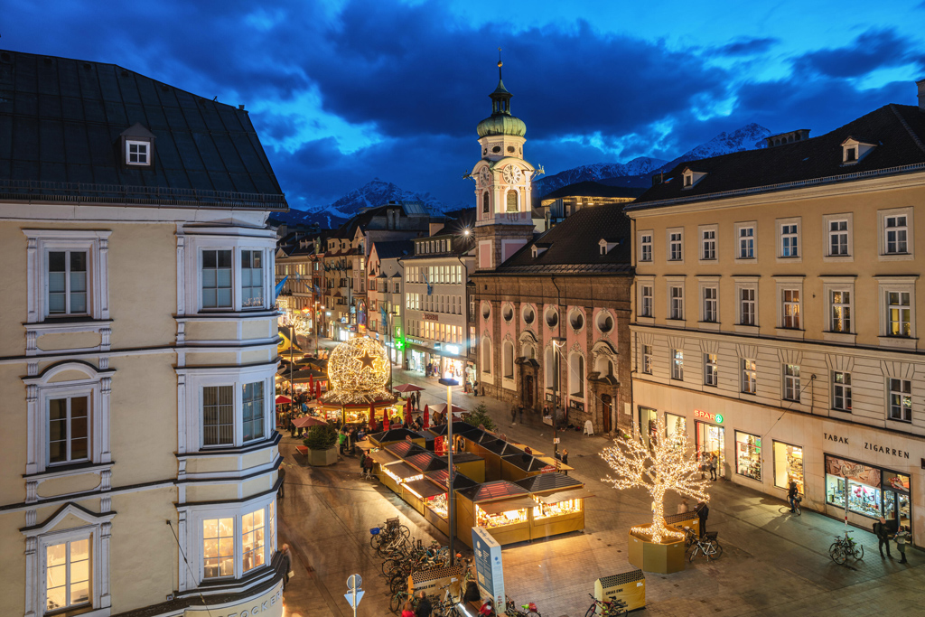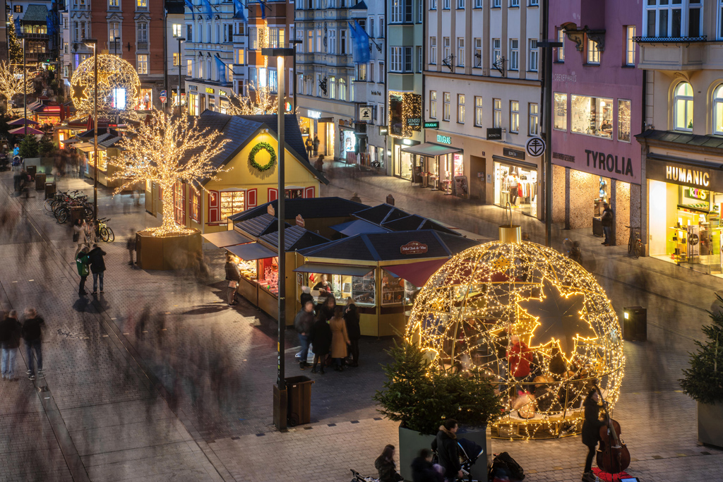 Mitten im modernen Herzen Innsbrucks, auf der belebten Maria-Theresien-Straße, erwartet euch ein Weihnachtsmarkt, der Tradition und Moderne vereint. Festlich beleuchtete Bäume und elegante Lichtinstallationen schaffen eine besonders stimmungsvolle Atmosphäre. Hier findet ihr moderne Weihnachtsdekorationen und internationale Spezialitäten. Die verschneiten Berge im Hintergrund sind die perfekte Kulisse, um sich bei einem heißen Glühwein oder Punsch aufzuwärmen.